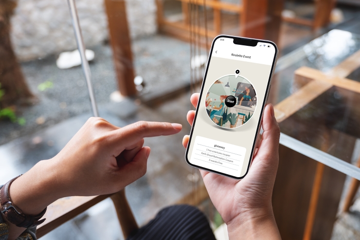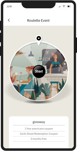 스탬프를 찍으면 룰렛이 움직이기 시작해 고객에게 쿠폰을 드립니다.
